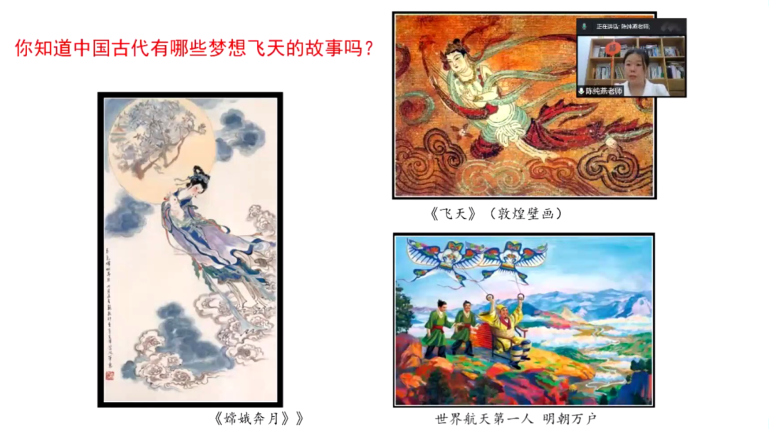 在《学画中国画——星辰大海 向梦而生》的课堂上,温州市教坛新秀、一级教师、来自开云电子(中国)官方网站_开云电子(中国)官方网站城附属学校的陈纯燕老师以《嫦娥奔月》《飞天》(敦煌壁画)等的画作为引,向海外华裔青少年们展示了中国古代人们对于航天梦的憧憬与追求,并介绍了中国航天事业的不断发展与各项重大突破,彰显了中华民族对于“蓝天梦想”的不懈追求与拼搏精神。