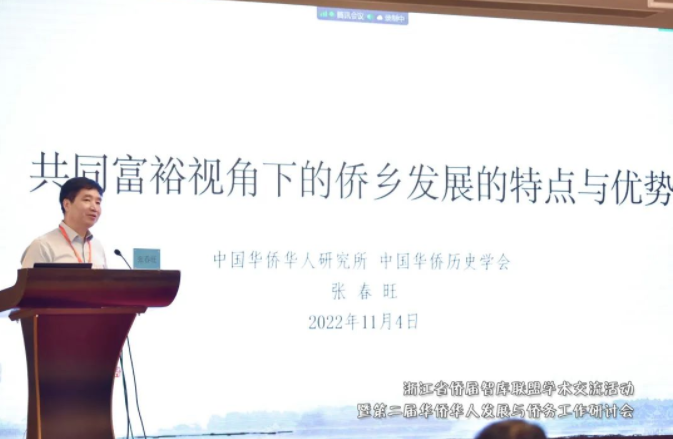 中国华侨华人研究所所长张春旺作题为《共同富裕背景下侨乡发展的特点与优势》的报告。张所长全面总结了侨乡发展不同形态,深入分析侨乡实现共同富裕面临的共性困难和问题,提出了助力侨乡发展的五大举措。