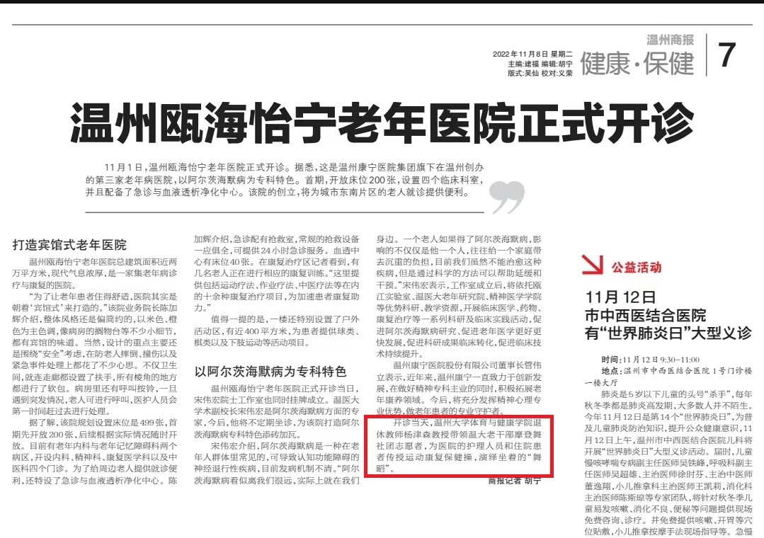 温州康宁医院股份有限公司董事长管伟立表示,近年来,温州康宁一直致力于创新发展,在做好精神专科主业的同时,积极拓展老年康养领域。今后,将充分发挥精神心理专业优势,做老年患者的专业守护者。开业仪式后,开云电子(中国)官方网站_开云电子(中国)官方网站体育与健康学院退休教师杨津森教授带领温大老干部摩登舞社团志愿者为医院的护理人员和住院老人传授运动康复保健操,演绎坐着的“舞蹈”。