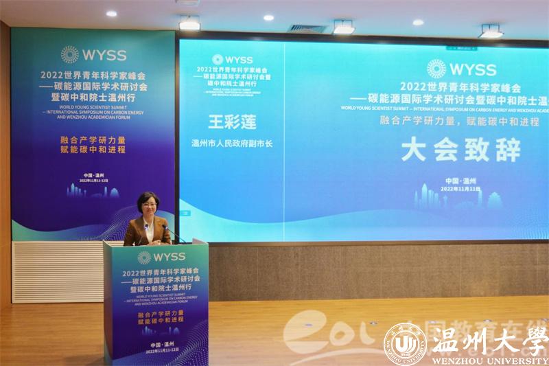 王彩莲致辞。她指出,党的二十大强调要加快发展方式绿色转型,积极稳妥推进碳达峰碳中和,这为“双碳战略”指明了新的前进方向。浙江省委、省政府高度重视碳达峰碳中和工作,温州市委、市政府出台新能源产业创新发展五年行动方案,实施清洁能源倍增、科技创新引领、产业基础再造、项目投资千亿、多跨融合应用五大工程。她强调,加强新能源产业的高端化、规模化、集群化发展,需要关键核心技术的强力支撑,需要政产学研用的聚力融合,需要海内外高端人才的鼎力支持。希望能以青年科学家峰会为契机聚智慧、聚资源、聚人才,恳请与会院士专家在加强关键核心技术攻关、提高成果产业化转化水平、打造区域重要人才中心和创新高地等方面给予温州更多的支持和帮助,助力温州实现碳达峰碳中和的战略目标,创造美好绿色未来。