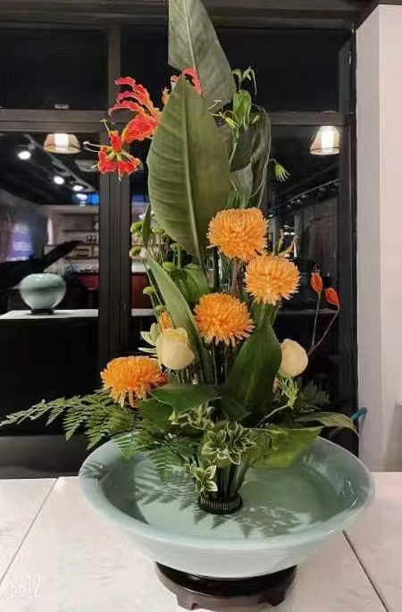 “对了,插花的同时,我们得跟花儿交流,告诉它,我想让你变得更美,于是,花就真的变得更美了。”