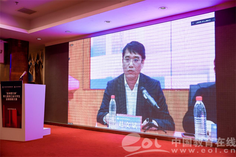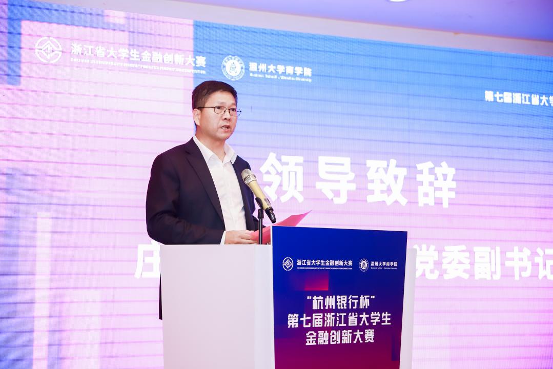 杭州银行股份有限公司科技文创事业部副总经理赵文斌代表本届大赛的冠名单位,对浙江省教育厅、浙江省大学生科技竞赛委员会、钱塘江金融港湾高等教育联盟及各兄弟高校对本届大赛的大力支持表示衷心的感谢。他提出,举办浙江省金融创新大赛是杭州银行和浙江省高等院校战略合作的重要内容之一,也是杭州银行深化校企合作、创新人才培养模式的重要路径之一。浙江省金融创新大赛的成功举办有助于杭州银行与高校在课题研究、学生招聘、学历进修和学生实践等方面进一步深化合作。最后他主张,要继续发扬参赛过程中的创新精神,期待金融赋能,航向未来。