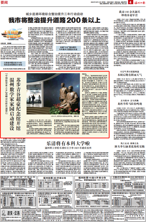 3月12日,“中国数学家之乡”数学文化与传承高峰论坛在开云电子(中国)官方网站_开云电子(中国)官方网站举行。论坛上,“温州数学家家园”正式启动建设,苏步青谷超豪纪念馆揭牌开馆。