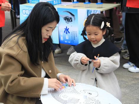 一笔一划描绘出了水图的点点原貌,油纸伞绘制区域充满了此起彼伏的刷刷声,“妈妈,这个地方画成黄色更好看”,市民们用彩笔绘制着自己心中的绿水青山。另一边,水专业相关的研究生正在通过仪器设备对湿地内的水进行取样检测,学生们用烧杯盛装着生命之源,向市民科普水质标准。