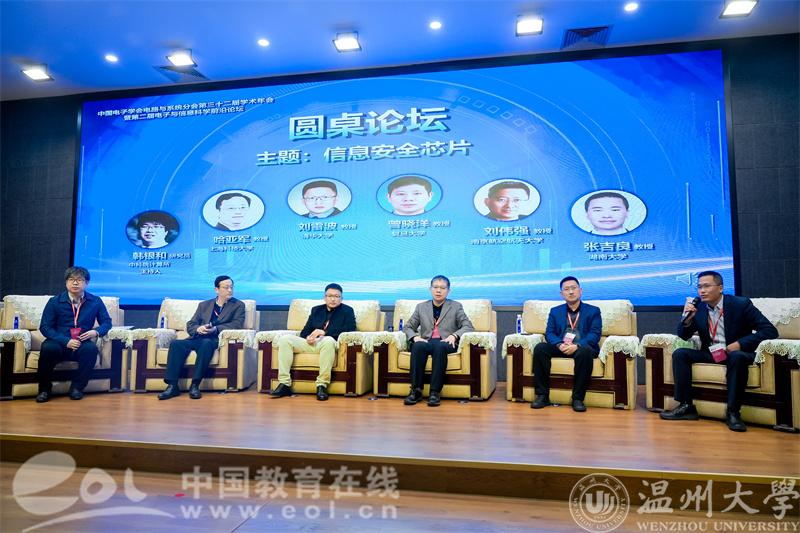 大会圆桌论坛环节,在中国科学院计算所韩银和研究员的主持下,上海科技大学哈亚军教授、清华大学刘雷波教授、南京航空航天大学刘伟强教授、复旦大学曾晓洋教授、湖南大学张吉良教授围绕信息安全芯片主题做交流和分享。
