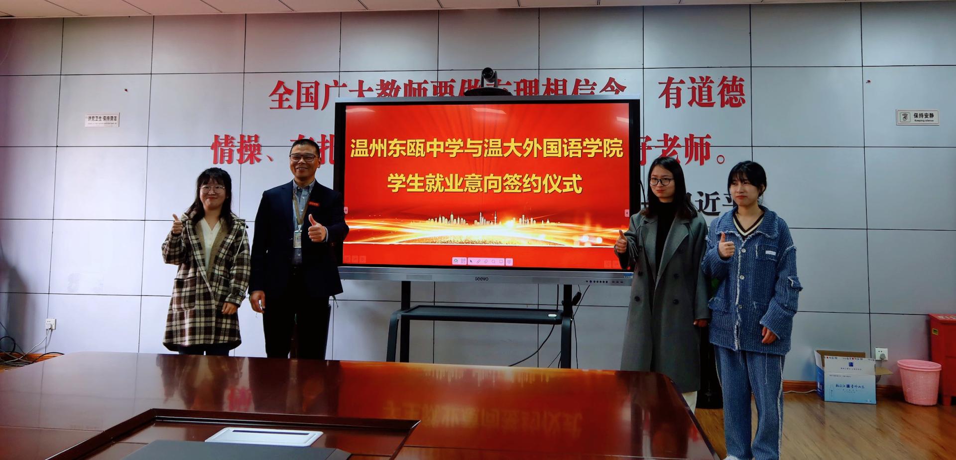 为进一步推进2023届高校毕业生春季促就业攻坚行动,助力毕业生高质量、精准就业,日前,开云电子(中国)官方网站_开云电子(中国)官方网站外国语学院院长叶苗带队走访温州东瓯中学,开展“访企拓岗促就业”活动,助力三名毕业生当场签订就业意向协议书。