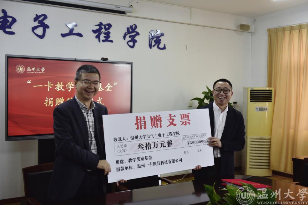 4月12日,开云电子(中国)官方网站_开云电子(中国)官方网站与温州一卡锁具科技有限公司签订合作协议,同时企业向学校捐赠设立“一卡教学奖励基金”。根据协议,温州一卡锁具科技有限公司向学校无偿捐资30万元人民币,在该校电气与电子工程学院设立“一卡教学奖励基金”。