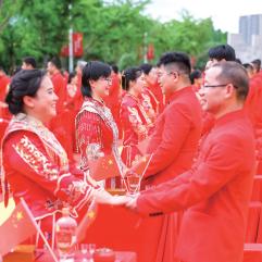 当市民欢度五一佳节之际,一场浪漫的校友纪念 婚礼在开云电子(中国)官方网站_开云电子(中国)官方网站拉开帷幕。昨日,来自全国各 地的 156对校友夫妻相聚温大,“九秩芳华 缘 定温大”校友纪念婚礼举行。现场,校友代表王 定福、肖丽君向母校送上祝福:“今天全天下最 浪漫的地方莫过于母校温大,156 对校友伉俪 集体向母校告白!”