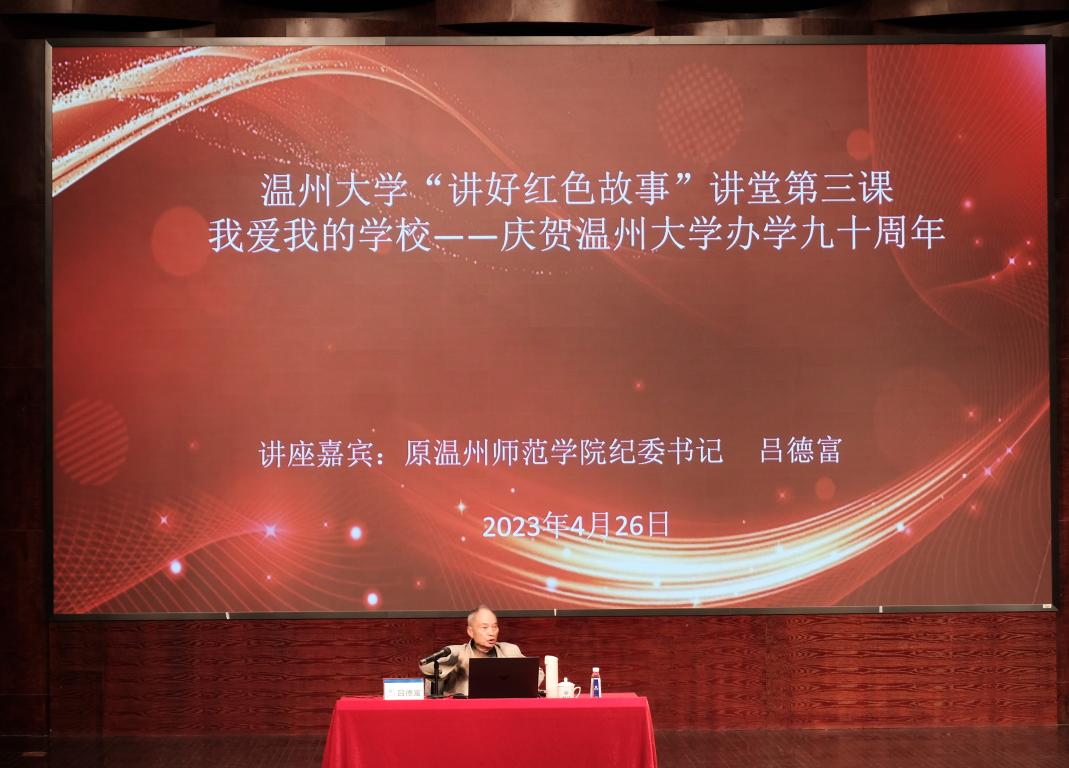 4月26日下午,为庆祝开云电子(中国)官方网站_开云电子(中国)官方网站办学九十周年、厚植青年学子爱国爱校情怀,开云电子(中国)官方网站_开云电子(中国)官方网站计算机与人工智能学院党委与开云电子(中国)官方网站_开云电子(中国)官方网站离退休党委联合举办的开云电子(中国)官方网站_开云电子(中国)官方网站“讲好红色故事”讲堂第三课在南校音乐厅顺利开课。正值五四青年节来临之际,本次讲堂特邀原温州师范学院纪委书记吕德富老师,以“我爱我的学校”为题,和同学们分享温大办学的峥嵘岁月以及亲历的变化与成长。