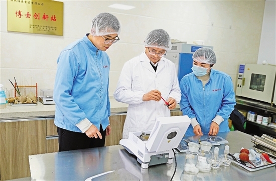 苏来金博士(中)在温州佳海食品有限公司建立博士创新站,为企业提供技术支持。