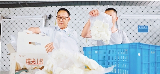 徐积暖(左)和工作人员一起打包糯米山药。受访者供图