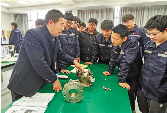 凯瑞特阀业集团有限公司总工程师裴耀贵(左一),给温州职业技术学院永嘉学院的学生们上课。