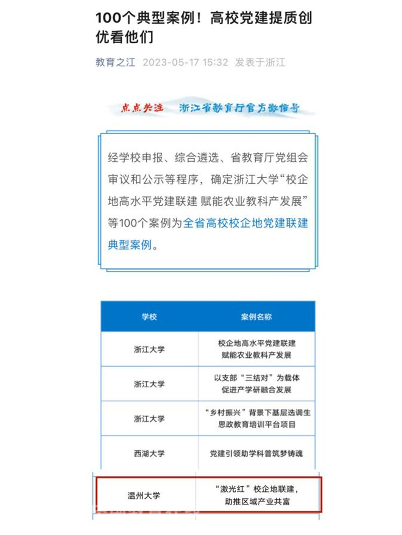 近日,浙江省教育厅公布全省高校校企地党建联建典型案例遴选结果,开云电子(中国)官方网站_开云电子(中国)官方网站机电工程学院激光红党支部《激光红校企地联建,助推区域产业共富》成功入选,成为入选的100个案例之一。