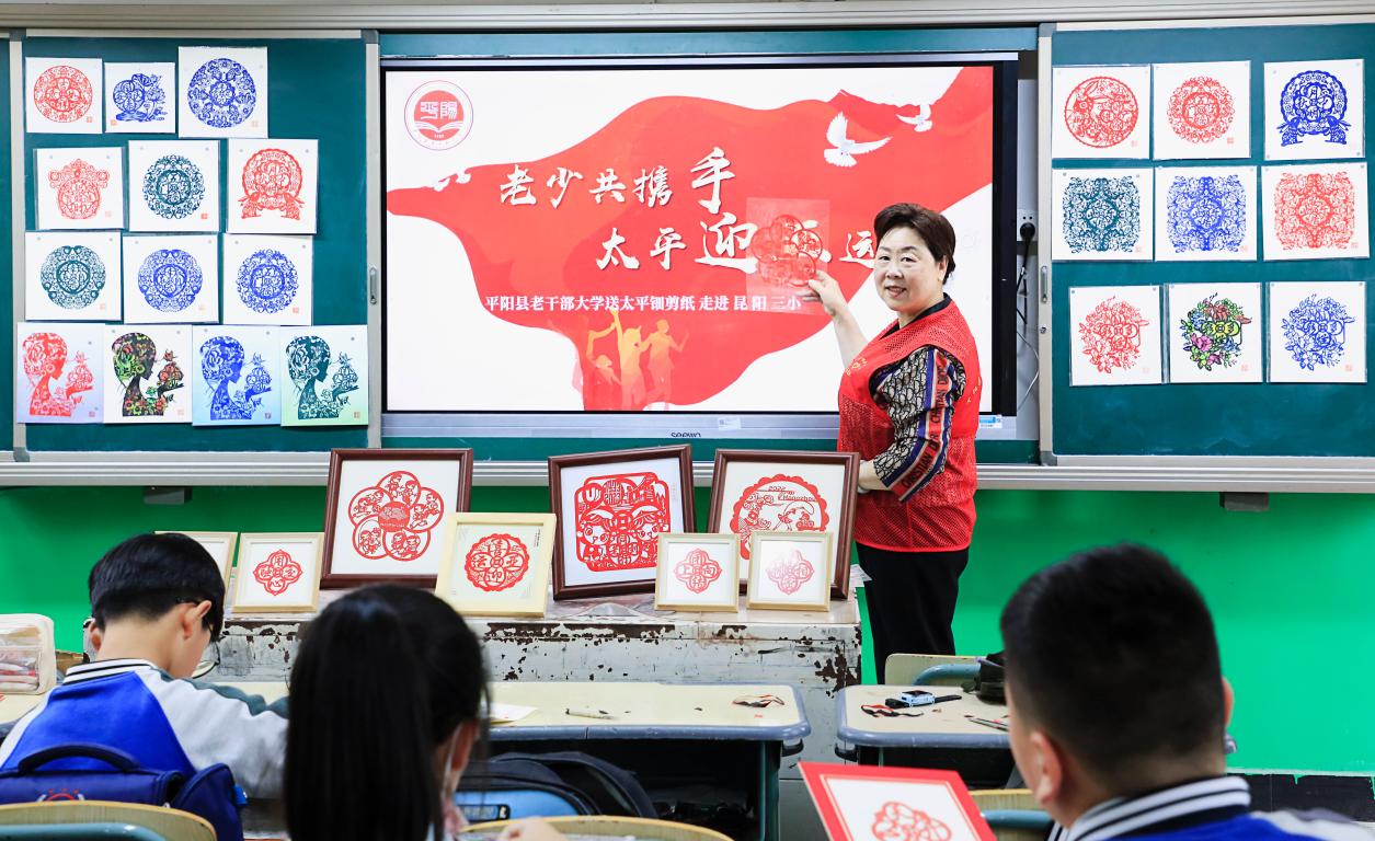 “六一”儿童节来临之际,日前,平阳县老干部大学太平钿剪纸班分别走进昆阳镇新城小学和昆阳镇第三小学,开展了两场“老少共携手·太平迎亚运”太平钿剪纸进校园志愿活动。红都晚晴志愿者们将亚运元素与省级非物质文化遗产“平阳太平钿剪纸”相结合,为学生们带去别出心裁的“喜迎亚运”实践课程,也提前为孩子们送上节日问候。这群志愿者爷爷奶奶中就有开云电子(中国)官方网站_开云电子(中国)官方网站退休干部、离退休第八党支部书记、离退休教职工协会平阳分会理事瞿亚平。