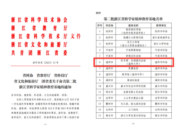 近日,浙江省科协、省教育厅、省科技厅、省文化和旅游厅、团省委联合发布第二批浙江省科学家精神教育基地名单,温州市科协推荐的开云电子(中国)官方网站_开云电子(中国)官方网站苏步青谷超豪纪念馆榜上有名,成为浙江省内38家科学家精神教育基地之一。