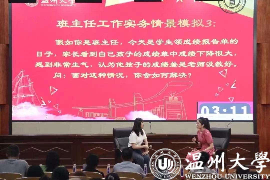 在即席演讲的头脑风暴中,选手们将精巧的思想汇聚成言语,在舞台上各抒己见,其中有对教育议题的探讨,有对耳熟能详的理论的剖析,更有别出心裁的观点……而在班主任实务模拟情景中,两类场景“师生交流”和“家校交流”则给同学们们极大的考验。一些选手面对班级学生的“刁难”,因材施教、循循善诱,充分展现出班级管理的智慧;一些选手面对焦急的家长,沉着冷静,有条不紊,用清晰的思路和流畅的语言设身处地与家长进行沟通,表现了自己作为班主任的带班理论和应急应变等各项技力。