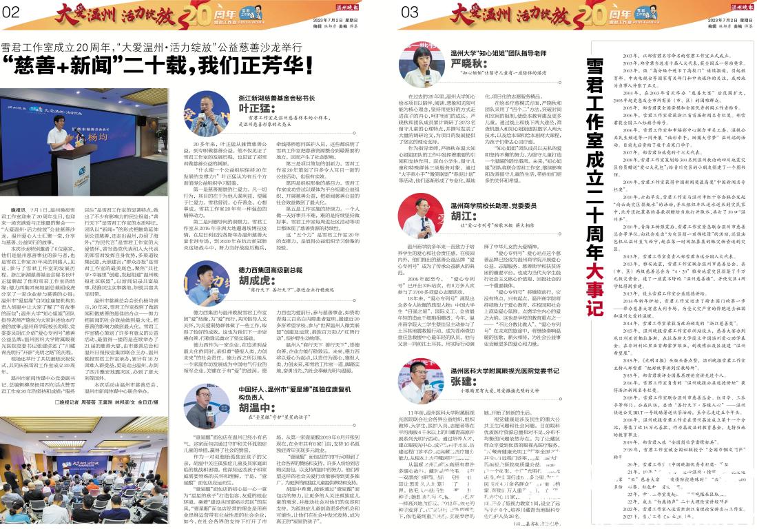 7月1日,温州晚报雪君工作室迎来了20周年生日,也迎来一场充满爱与正能量的聚会——“大爱温州·活力绽放”公益慈善沙龙。温州爱心人士汇聚一堂,分享与慈善、公益同行的故事。