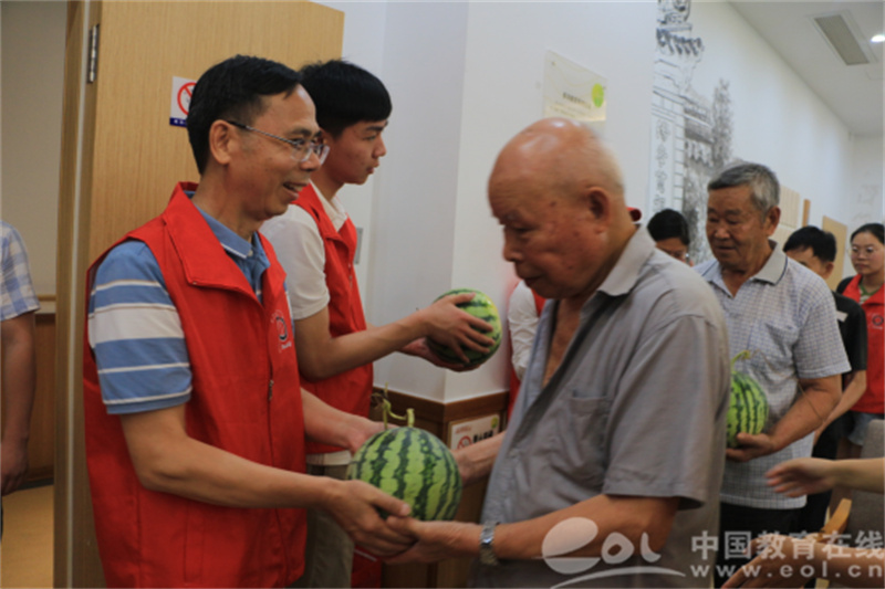 “这么热的天,你们大学生志愿者帮助我们清洁社区环境,给我们社区老人送来西瓜,还上门看望和陪伴独居老人,给老人们带来快乐和好心情,真是太感谢你们了……”7月7日上午,茶山街道养老服务中心主任林文港在山根社区握着温大“阳光”志愿者鲁逸晨同学的手,真诚地表达自己的感谢之情。