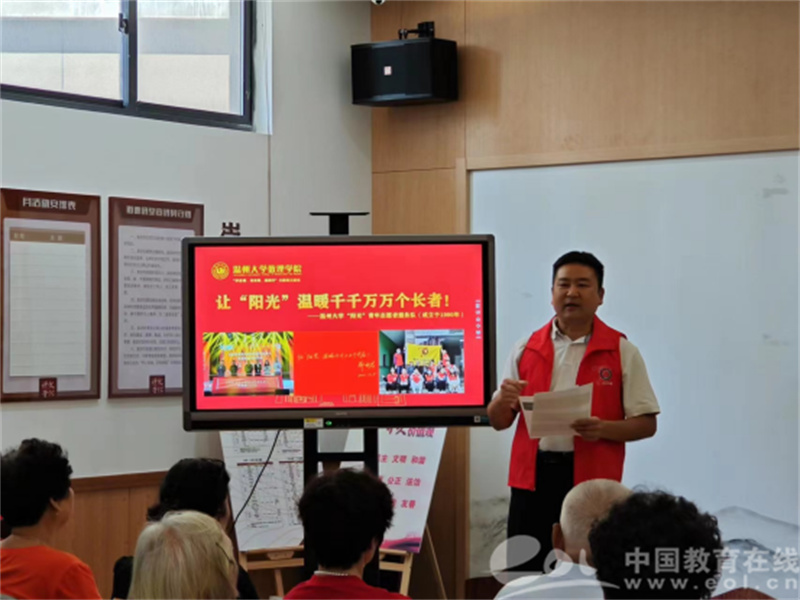 在山根社区新时代文明实践站,数理学院党委副书记章志图为社区老人和学院师生们带来一节《习近平总书记尊老敬老的暖心故事》主题微党课,用8个小故事让大家了解党和政府对老年群体的深切关爱,并鼓舞更多年轻师生投入到尊老敬老、爱老助老的志愿服务活动中。