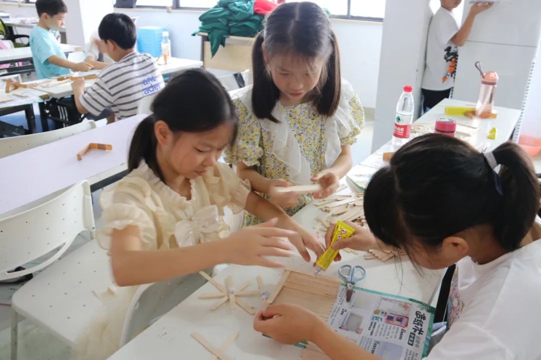 活动中,大学生志愿者们发挥自己的专业特长,向孩子们讲述历史气息浓厚的温州古建筑,并以图文影视等方式带领他们观赏鹿城中山公园、江心屿文天祥祠,温州妙果寺、三垟周氏旧宅,龙湾永昌堡、瑞安圣井山石殿、洞头望海楼、乐清百岁亭等古建筑,讲述一个个有趣的故事。在孩子们一声声惊叹中,进入到本次课程的高潮部分——化身小小建筑师,搭建独特风格的建筑。大学生志愿者们将孩子们分成多个小组指导他们设计建筑图并动手实验,引导孩子们建地基、搭木房、配装饰等。在这期间,每一个孩子都积极地参与,表达自己的想法,利用雪糕棍和胶水将想法付诸于作品,最后的成品都栩栩如生。
