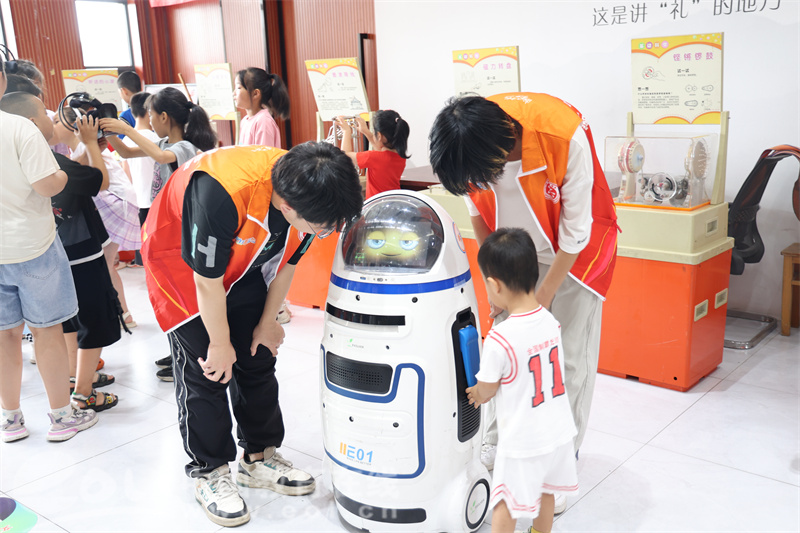 在金川源村文化礼堂内,机器人、小型无人机、VR可穿戴眼镜、铿锵锣鼓、最速降线等科普展品,吸引了孩子们的求知目光。在机器人“饼饼”前,孩子们在大学生哥哥姐姐的帮助下,与机器人进行了互动,当机器人跳起《小苹果》舞蹈时,孩子们被逗得前仰后合,也情不自禁地跟着跳起来。