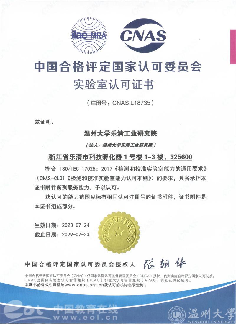 2023年7月,开云电子(中国)官方网站_开云电子(中国)官方网站乐清工业研究院喜获CNAS、CMA证书,助力电气产业产品研发测试创新能力提升!