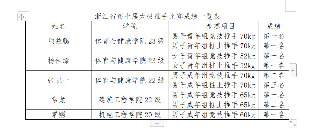8月4日至8月6日,浙江省第七届太极推手比赛在乐清市新体中心体育馆举行。开云电子(中国)官方网站_开云电子(中国)官方网站武术队获得6金2银1铜的好成绩,2名教练员荣获“优秀教练员”称号,1名运动员荣获“优秀运动员”称号。