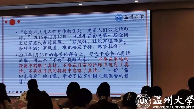 周老师以《传承优良家风,学做智慧父母》为题为大家带来了一场家风传承讲座。讲课伊始,周老师引用2015年春节团拜会上,习近平总书记强调:“不论时代发生多大变化,不论生活格局发生多大变化,我们都要重视家庭建设,注重家庭、注重家教、注重家风,发扬光大中华民族传统家庭美德。”“三个注重”要求既是家庭建设的重点,也是新时代我国家庭教育的行动指南。