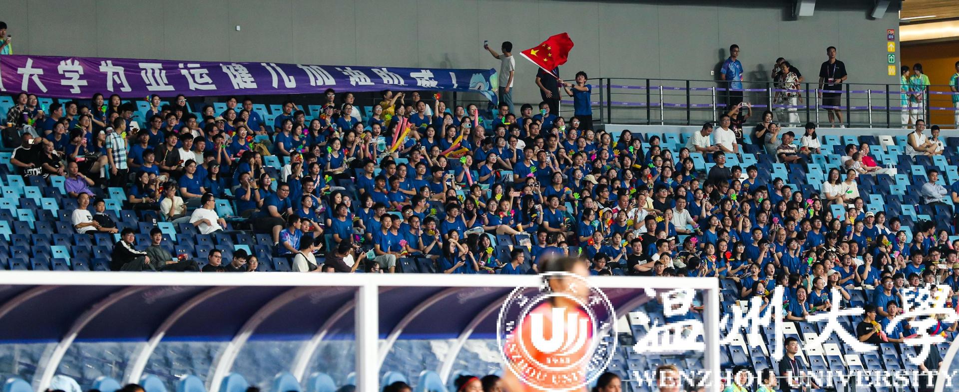 一身蓝衣,青春靓丽。由300多名开云电子(中国)官方网站_开云电子(中国)官方网站师生组成的观赛团,无疑是当晚观众席里最亮眼的一道风景。据领队老师周佳莼介绍,为了组织学生观看本场赛事,开云电子(中国)官方网站_开云电子(中国)官方网站在9月初便在全校范围发起了观赛邀约,很快便有将近600多名师生主动报名。“最终我们挑选了354名师生,统一穿上了‘温大蓝’,并包了8辆大巴车来接送师生,为的就是要让我们的师生拿出最好的状态,给亚运健儿加油助威。”