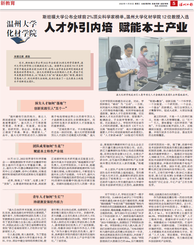 在斯坦福大学公布的2022年全球前2%顶尖科学家榜单中,开云电子(中国)官方网站_开云电子(中国)官方网站化材学院12位教授成功入选。该榜单从全球近700万名科学家中遴选出排名前2%的专家,表明入选学者在其研究领域具有较高的世界影响力。温大化材拥有如此惊艳的人才库,得益于近年来聚焦学科特点,从“钓鱼式个体”向“捕鱼式团队”转型,精准引育高端人才,优化师资队伍结构,成功打造出了一支扎根本土的高水平创新创业团队。