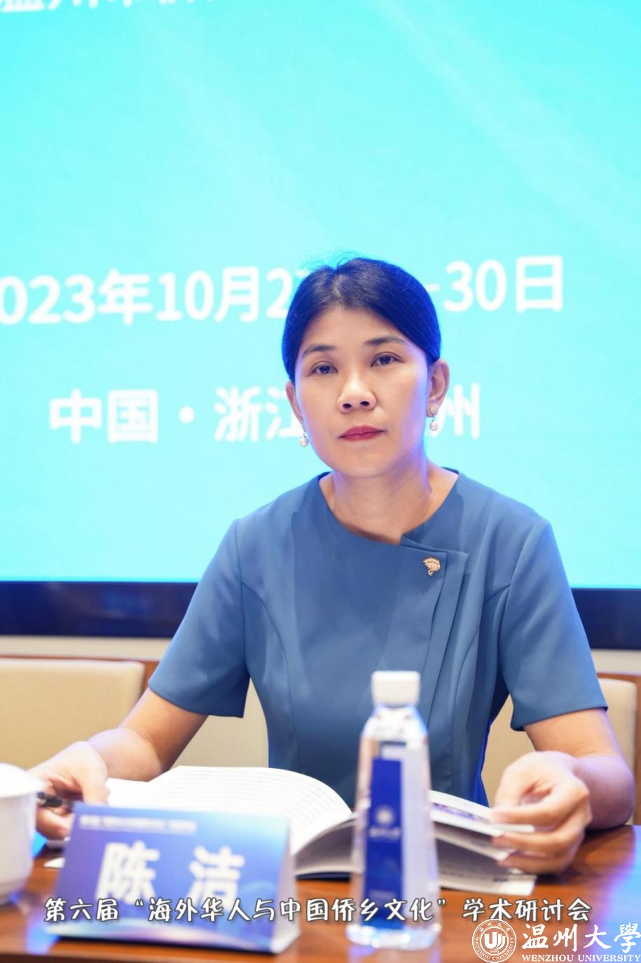 广西壮族自治区党委统战部副部长陈洁在大会上致辞。她指出,第六届“海外华人与中国侨乡文化”学术研讨会是该系列会议第一次走出广西,走进全国重要侨乡浙江温州,开启省域之间、新侨乡与老侨乡之间的合作交流,这样一种创新模式一定会取得更加丰硕的成果。长期以来,一代又一代海外华侨华人,积极热情支持祖(籍)国经济社会发展和现代化建设各项事业,为促进祖国和平统一大业、增进我国人民同世界各国人民的友好合作作出了积极贡献。他们既是中外友好合作的亲历者,也是见证者、推动者,更是中国式现代化的建设者。在当前推进中国式现代化的进程中,华侨华人的角色不可或缺。本次研讨会适应新时代侨务工作发展的需要,对于研究新侨情、新情况、新问题,找到破解新路径,推动侨务工作的可持续发展具有重要意义。会议聚集了全球华侨华人研究的专家学者,有助于达成侨务理论研究的有关共识,促进有关领域研究,是一次为新时代侨务工作破解难题的新契机。