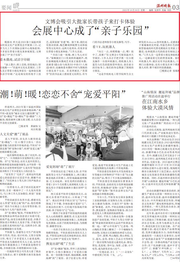 昨天是2023第十届温州国际时尚文化产业博览会开展第三日,记者当天上午在国际会展中心现场看到,许多家长带着小朋友来参观展览,文博会成了个“亲子乐园”。
