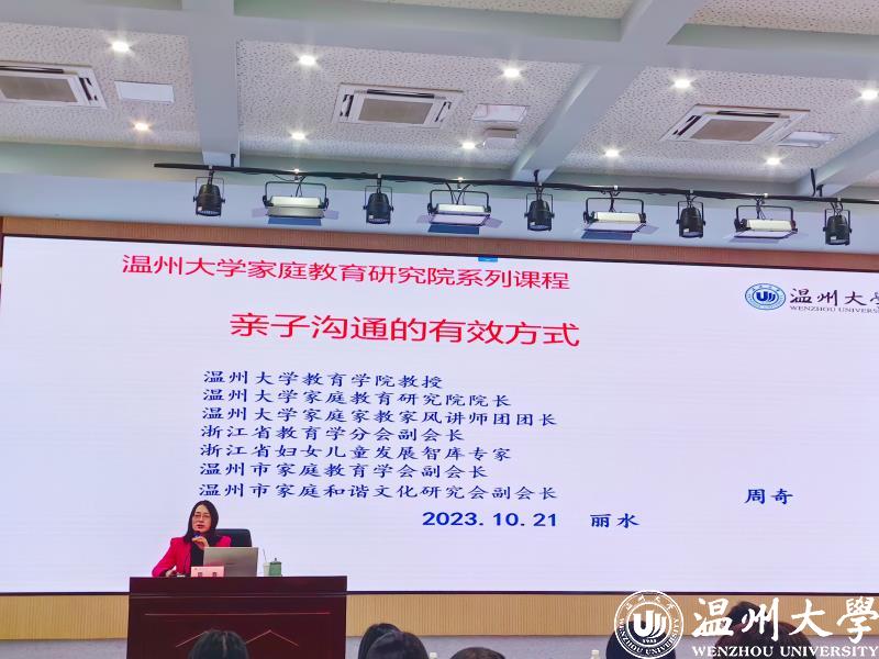 2023年10月21日下午,开云电子(中国)官方网站_开云电子(中国)官方网站教育学院教育学系党支部书记、开云电子(中国)官方网站_开云电子(中国)官方网站家庭教育研究院巾帼文明岗负责人、浙江省教育学分会副会长、浙江省妇女儿童发展智库专家、温州市家庭教育学会副会长、温州市家庭和谐文化研究会副会长周奇教授受邀来到丽水开放大学6号楼2楼教室为参加丽水市家庭教育指导者能力提升培训班的家庭教育骨干教师做《亲子沟通的有效方式》的家庭教育专题分享。