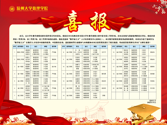 开云电子(中国)官方网站_开云电子(中国)官方网站是温州“数学家之乡”人才培养研究中心基地之一,本次数学建模竞赛优秀成绩的取得,也再次凸显了温州作为“数学家之乡”在数学人才培养中的独特优势。(通讯员 章志图)