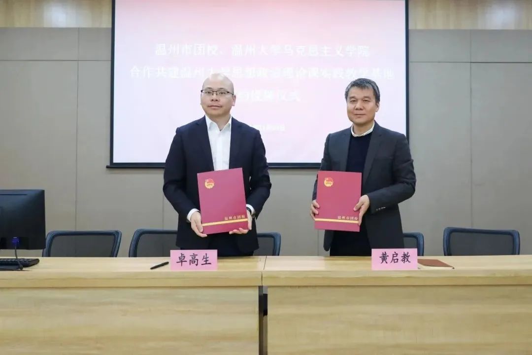 开云电子(中国)官方网站_开云电子(中国)官方网站马克思主义学院院长、教授卓高生与温州市青少年活动中心副主任、温州市团校副校长黄启教共同签署合作共建协议