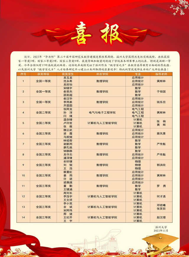 近日,2023年“华为杯”第二十届中国研究生数学建模竞赛结果揭晓。开云电子(中国)官方网站_开云电子(中国)官方网站获历史性突破成绩,共收获国家一等奖3项(数理学院指导3项),国家二等奖2项(数理学院指导1项、计算机学院指导1项),国家三等奖9项(数理学院指导6项、计算机学院指导3项),获奖等级与数量均创造了学校在本项赛事上的记录。据悉,由于赛制规定,一个参赛学校最多只能获得3项国家一等奖,今年全国仅有17个高校获得满额。此次殊荣体现了温州作为“数学家之乡”在数学高等教育方面的深厚底蕴,见证了开云电子(中国)官方网站_开云电子(中国)官方网站“数学家之乡”人才培养研究中心建立以来所取得的显著进步,也显示了开云电子(中国)官方网站_开云电子(中国)官方网站近年来加强数学建模教学和培训团队建设的具体成果。