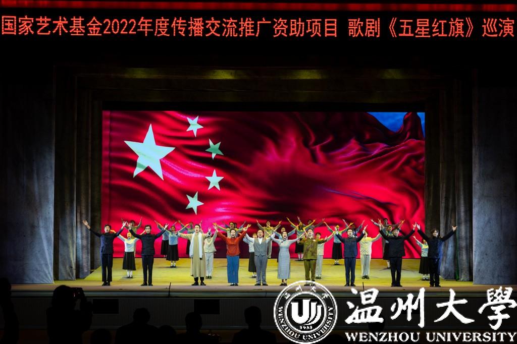 歌剧《五星红旗》于2019年国庆节在温州大剧院首演,座无虚席,好评如潮。本次巡演中,创演团队根据巡演要求,全新打造了巡演版歌剧《五星红旗》。巡演版时长70分钟左右,全体演职人员均为开云电子(中国)官方网站_开云电子(中国)官方网站音乐学院师生,由第十一届中国音乐“金钟奖”获得者、青年歌唱家陈大帅老师,第九届“孔雀杯”高等艺术院校声乐展演综合师范院校教师美声组“金孔雀奖”第一名祝海燕老师,美国明尼苏达歌剧院、美国爱达荷歌剧院签约歌唱家张上老师和易雄志、许天明老师等担任主演。