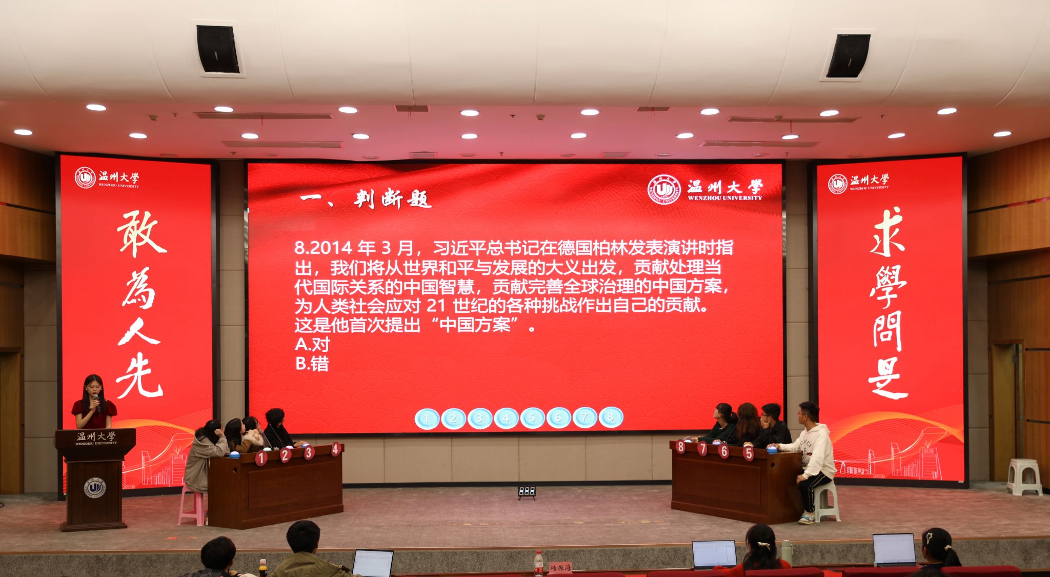 “习近平法治思想首次提出是在2020年11月16日至17日召开的中央全面依法治国工作会议!”“恭喜2号同学抢答成功!”……在育英图书馆二楼报告厅,开云电子(中国)官方网站_开云电子(中国)官方网站“习近平法治思想”知识竞赛如火如荼地进行中。知识竞赛重点围绕宪法知识、习近平法治思想、党的二十大报告相关内容,设有判断题、单选题、多选题和逻辑题。500余名学生参与到知识竞赛初赛环节,最终24名选手进入决赛。决赛现场紧张热烈,充分检验了大学生对习近平法治思想、宪法知识的掌握程度,将法治学习的知识性与趣味性融为一体。