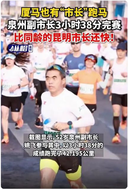 不约而同,稍早前落下大幕的上合昆明马拉松赛上,同样52岁的昆明市市长刘佳晨也参加了全程马拉松比赛。据报道,刘佳晨市长的全马净计时成绩为3小时47分48秒,在50-54岁年龄段的参赛选手中排名第116位。
