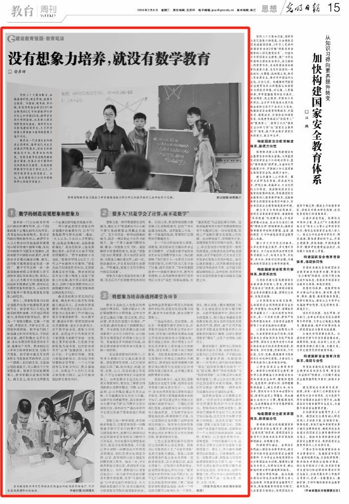 想象力不是生来就有的先天素质,而是后天开拓和教育培养的结果。长期以来,我国传统的数学教育缺乏惊奇和想象力,制约了学生创造力的发展。培养想象力不是一朝一夕就能实现的,需要我们长期坚持不懈地努力。