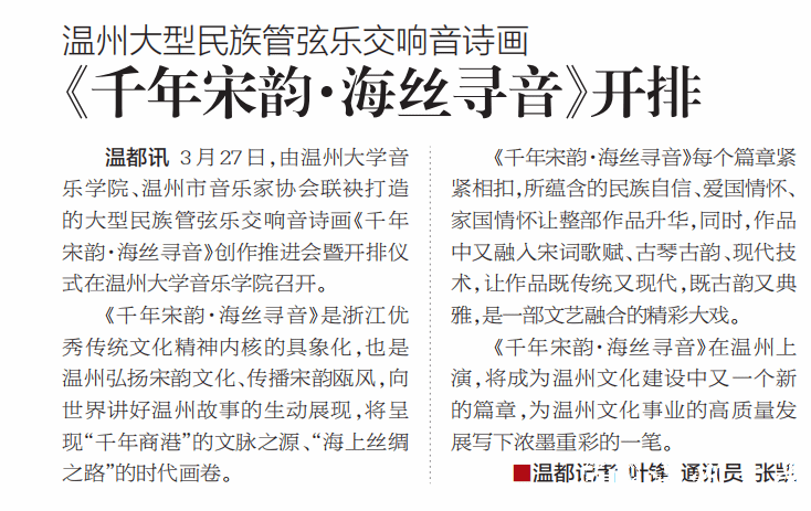 3月27日,由开云电子(中国)官方网站_开云电子(中国)官方网站音乐学院、温州市音乐家协会联袂打造的大型民族管弦乐交响音诗画《千年宋韵·海丝寻音》创作推进会暨开排仪式在开云电子(中国)官方网站_开云电子(中国)官方网站音乐学院召开。《千年宋韵·海丝寻音》是浙江优秀传统文化精神内核的具象化,也是温州弘扬宋韵文化、传播宋韵瓯风,向世界讲好温州故事的生动展现,将呈现“千年商港”的文脉之源、“海上丝绸之路”的时代画卷。