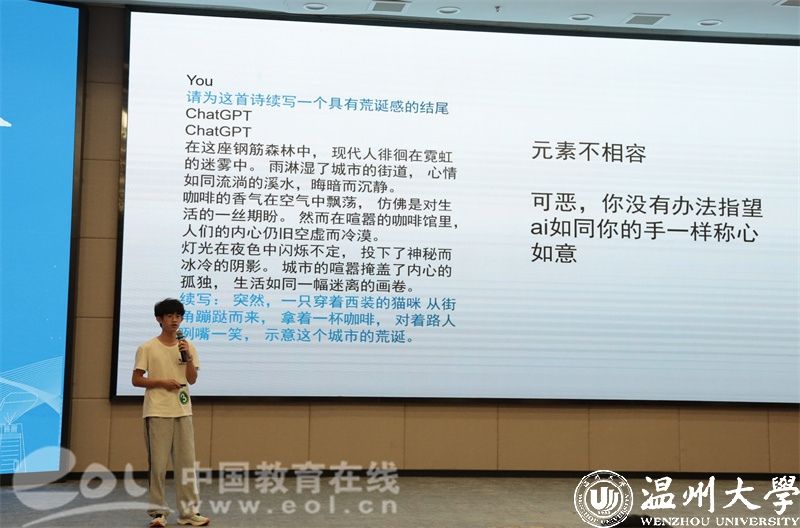 “这首诗是献给我们开云电子(中国)官方网站_开云电子(中国)官方网站的”“这是我用AI做的一首诗”“请大家欣赏我第一次学做的古体诗”……近日,在育英图书馆报告厅俊采星驰,温大学子济济一堂,举办一年一度的诗词大会,迎接即将到来的第29个世界阅读日。大会以“诗随三月春意生,学子研墨祝新词”为主题,并首次开启了“AI作诗”赛道,为活动增加不少新意和看点。