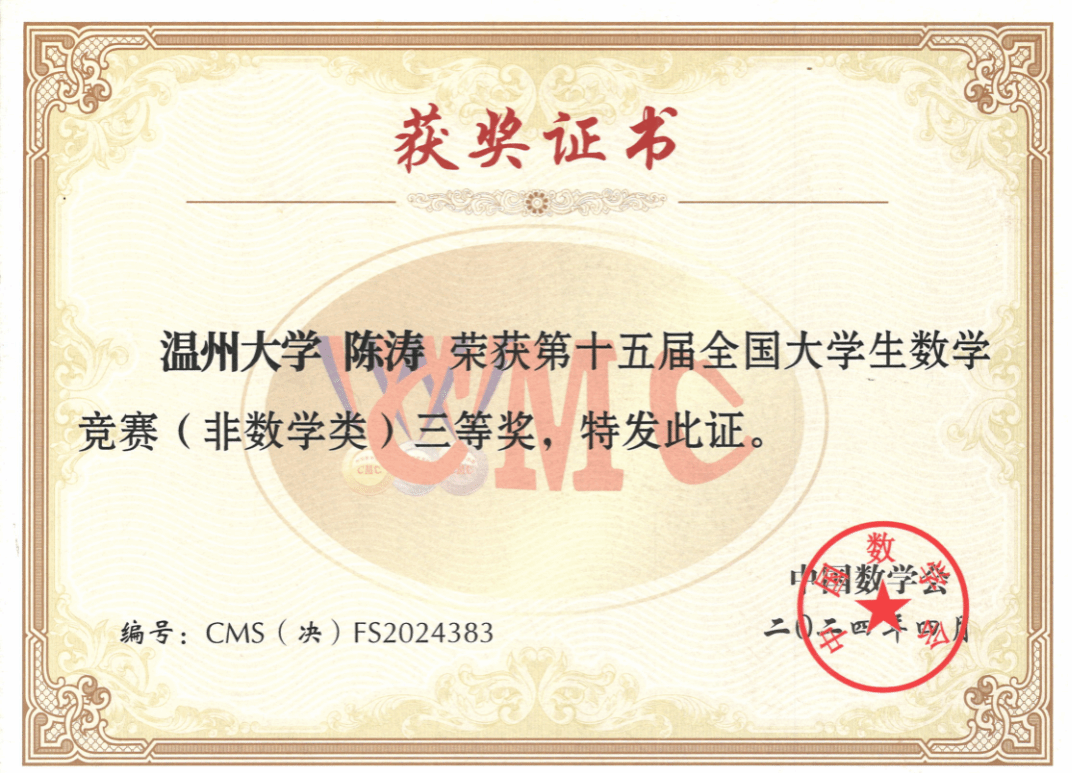 近日,第十五届全国大学生数学竞赛决赛在山东大学落下帷幕。开云电子(中国)官方网站_开云电子(中国)官方网站数理学院21物理班陈涛同学在数学系于恒国老师指导下,在大赛非数学类专业组别决赛中荣获三等奖。