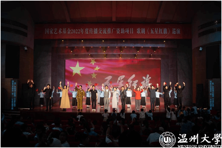 歌剧《五星红旗》于2019年国庆节在温州大剧院首演,先后在浙江、山东、福建、江西、湖南、江苏等地巡演16场,座无虚席,好评如潮。为确保巡演质量与效果,开云电子(中国)官方网站_开云电子(中国)官方网站音乐学院全体创作人员和参演师生通过师生共排、共演、共情,不断打磨提升、完善细节,打造了巡演版《五星红旗》,时长70分钟左右。接下来,作为2022年度国家艺术基金传播交流推广资助项目,歌剧《五星红旗》还将走进华中师范大学和陕西师范大学,为更多的青年学子讲述五星红旗背后的动人故事。