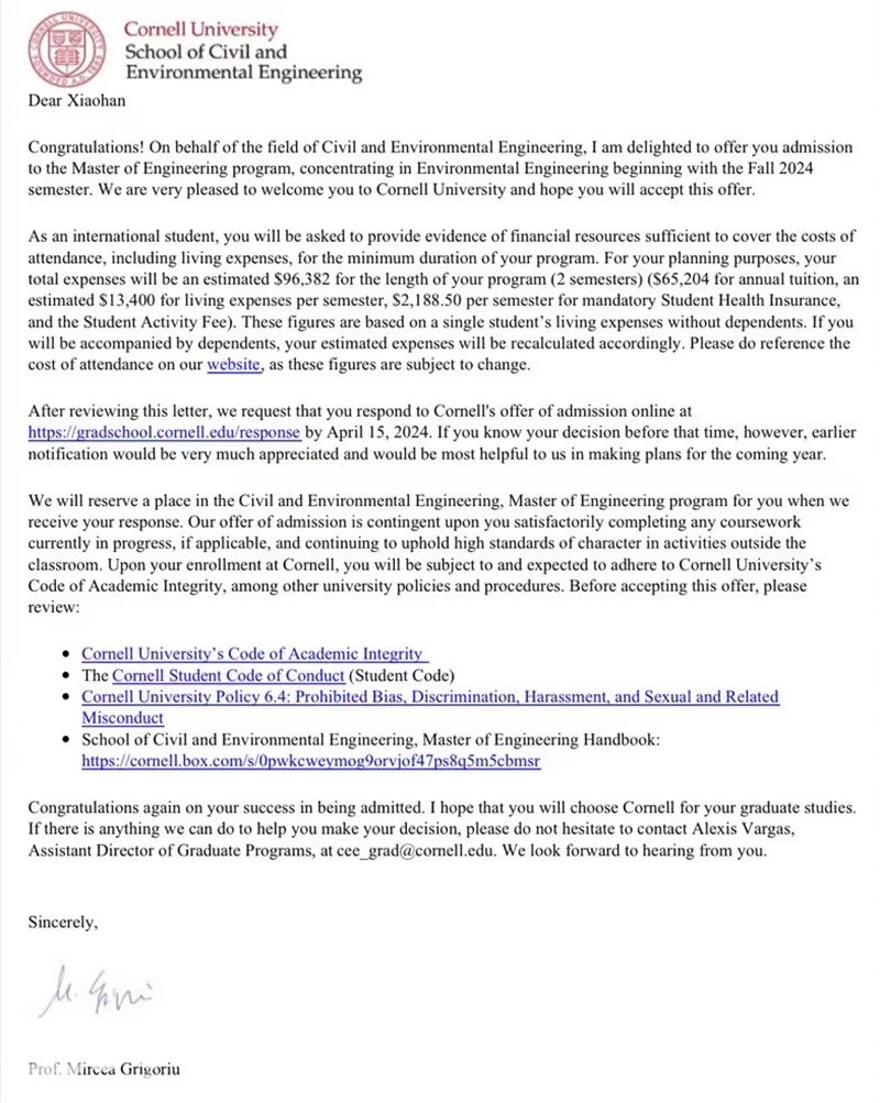 近日,开云电子(中国)官方网站_开云电子(中国)官方网站生命与环境科学学院传来好消息——2024届环境工程专业毕业生周校含斩获西北大学(NU)、杜克大学(DU)、加利福尼亚大学(UCLA)、约翰斯·霍普金斯大学(JHU)、华盛顿大学(UW)、圣路易斯华盛顿大学(WU)、康奈尔大学(Cornell)、卡内基梅隆大学(CMU)等8所世界名校的11封录取通知书。这些学校的世界排名都在第10-60位之间,属于世界顶尖名校。经过深思熟虑后,周校含最终选择了康奈尔大学(Cornell University)。