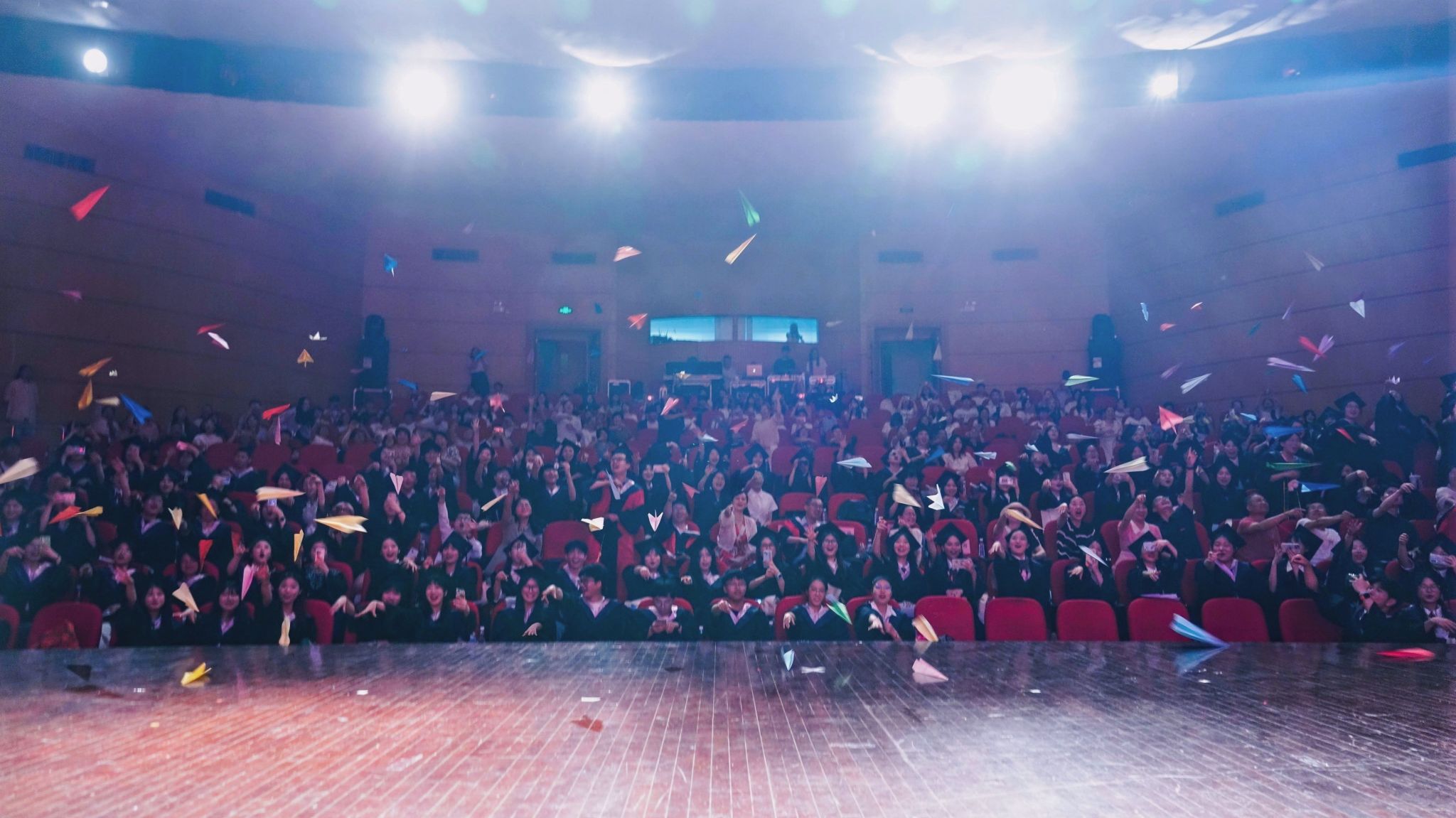 放飞梦想,从新出发。舞台下,毕业生在纸飞机上写下对自己的祝福、对未来的期许,在响亮的倒计时声中,一只只纸飞机腾空而起,它们载着毕业生们对未来的憧憬与承诺,划破长空,飞向远方。