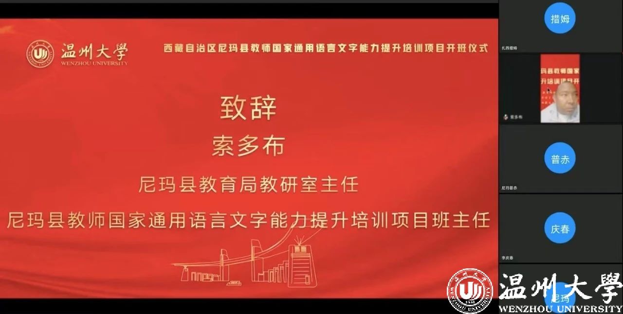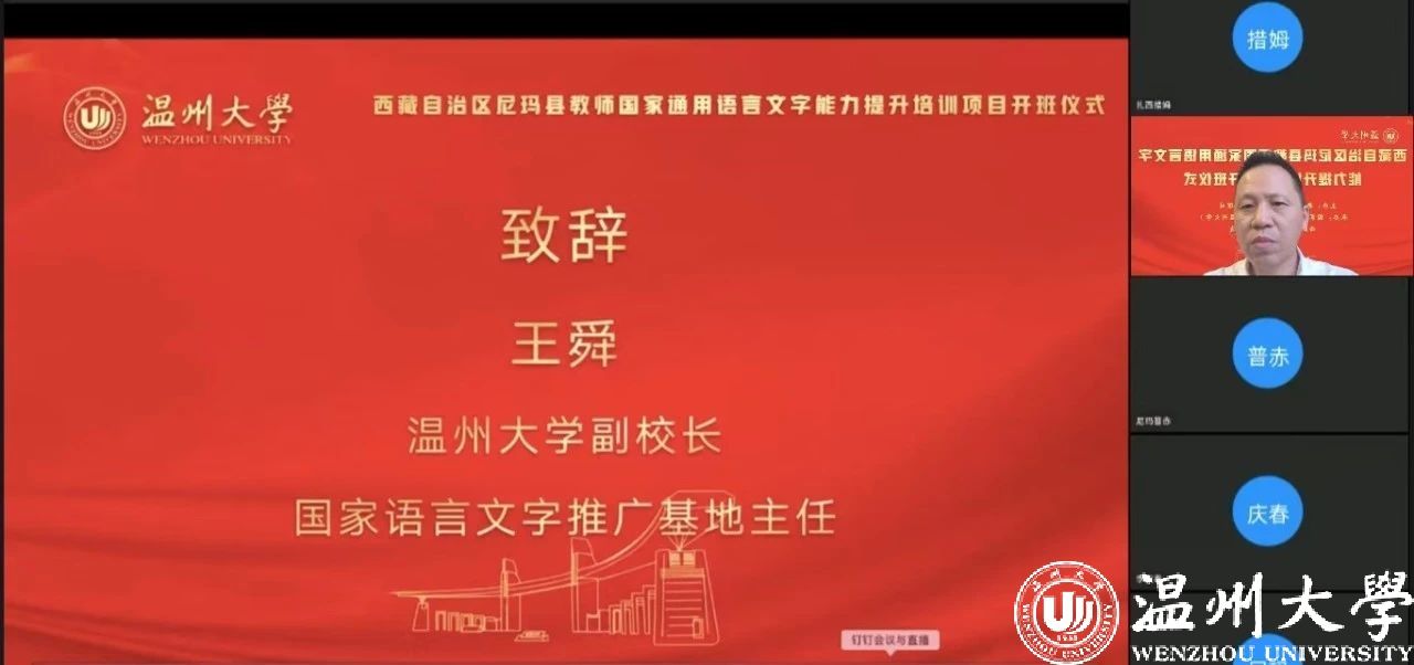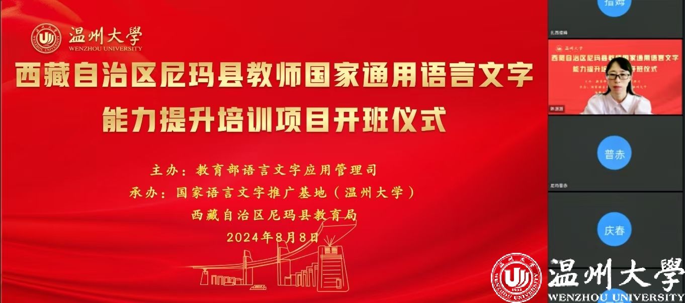 中国教育在线浙江站讯 (编辑 陈显婷 通讯员 温大萱)8月8日上午,由语言文字应用管理司主办,国家语言文字推广基地(开云电子(中国)官方网站_开云电子(中国)官方网站)、西藏自治区尼玛县教育局联合承办的“2024年西藏自治区尼玛县教师国家通用语言文字能力提升培训班”举行了线上开班仪式,国家语言文字推广基地(开云电子(中国)官方网站_开云电子(中国)官方网站)执行主任陈源源教授主持仪式。