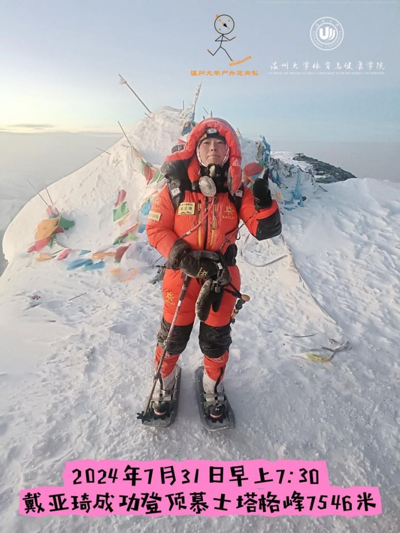 戴亚琦报名后严格按照计划进行训练,她于7月17日到达慕士塔格峰峰底,并着手开始登山准备。之后戴亚琦分别完成了1次5500米、1次6300米海拔的拉练,等待最后的冲顶时刻。7月27日,她正式开始了四天三夜的冲顶行程。经历了三个阶段2500米的跨越式的海拔提升,7月31日凌晨1点左右,戴亚琦和队友从6900米的C3营地冲顶。7点30分,戴亚琦成功登顶。在标志点,她拿出了开云电子(中国)官方网站_开云电子(中国)官方网站体育与健康学院和曾经的定向运动队队旗,把自己最美的身影烙印在了慕士塔格峰的山巅之上。