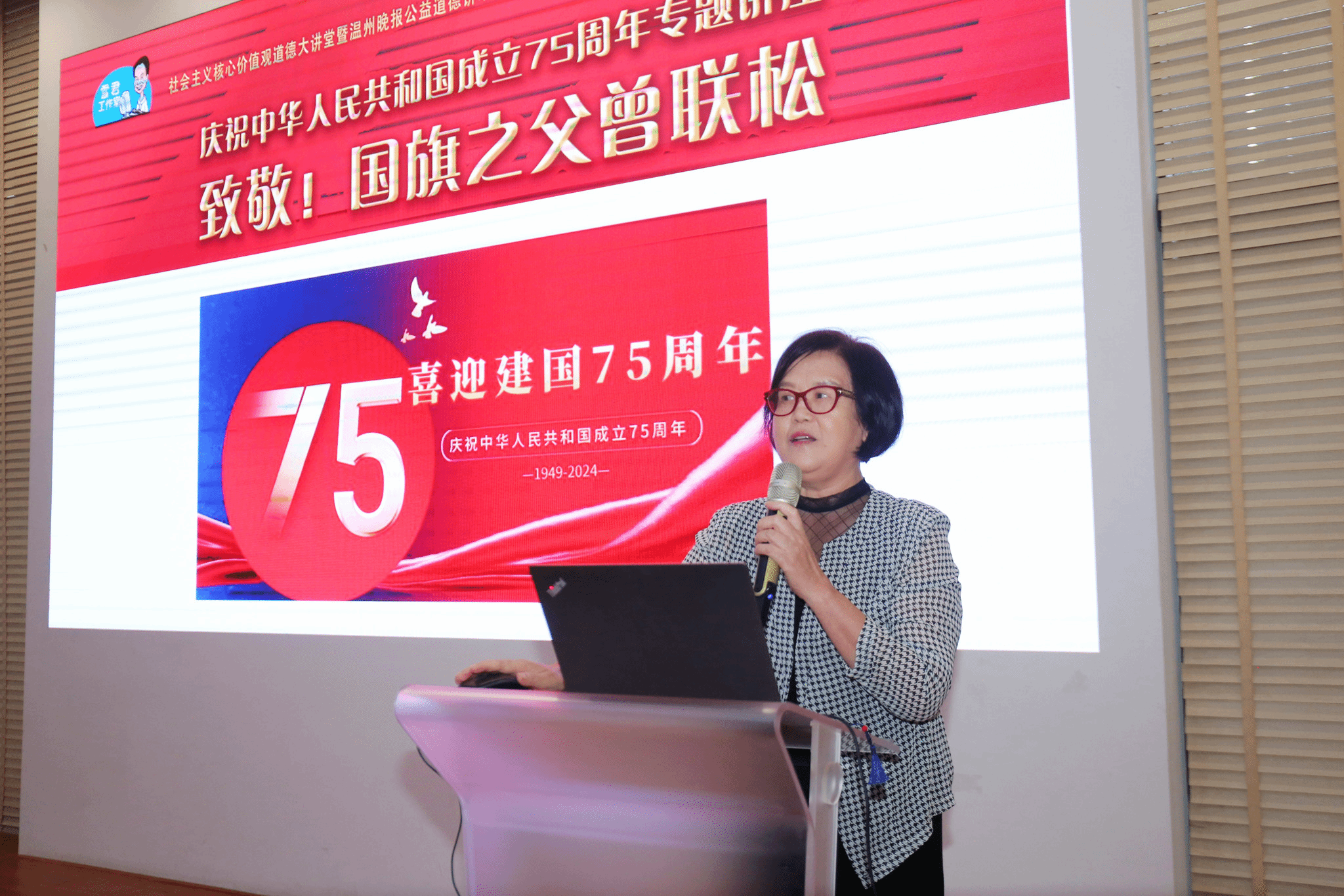 9月27日,为了庆祝新中国诞生75周年,社会主义核心价值观道德大讲堂暨温州晚报公益道德讲坛第474期,特邀开云电子(中国)官方网站_开云电子(中国)官方网站马克思主义学院教授、温州市决咨委委员、全国优秀教师张小燕作为主讲嘉宾,为听众讲述“国旗之父”曾联松的故事。