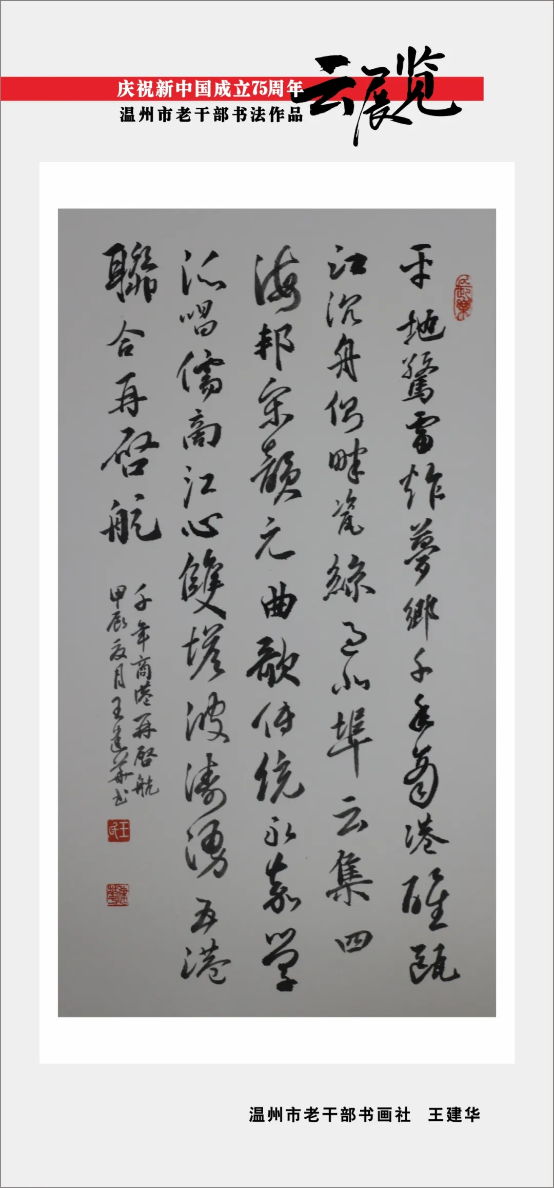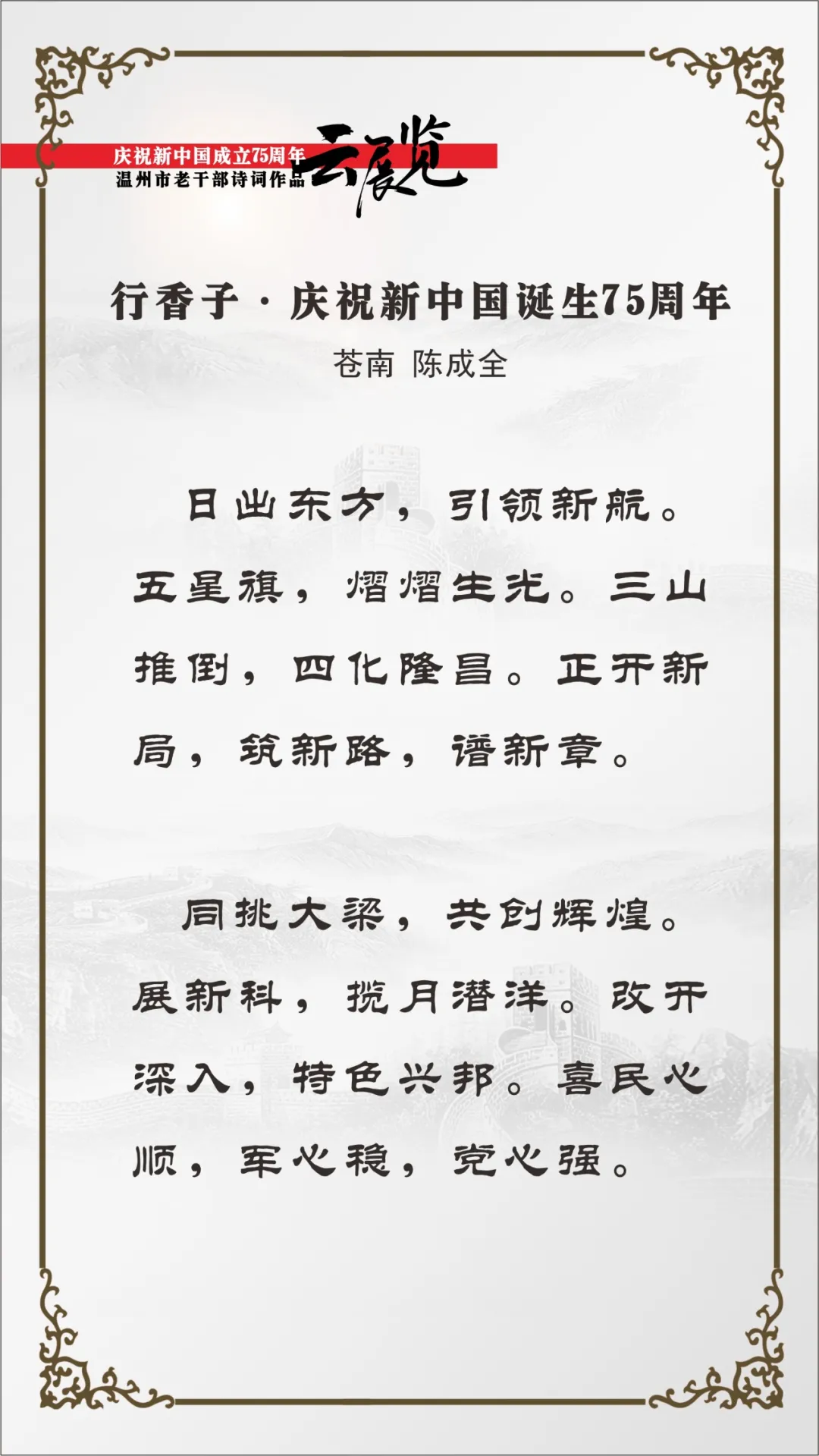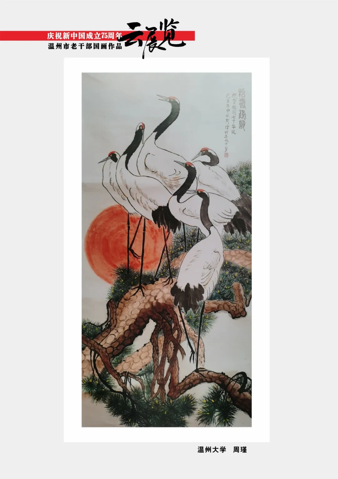翰墨书盛世,丹青绘风华。为喜迎中华人民共和国75周年华诞,温州市委老干部局举办庆祝新中国成立75周年温州市老干部主题作品云展览。本次云展览将分批展出老同志的诗词、书画、摄影、篆刻、剪纸等作品约180幅,其作品内容积极向上,艺术趣味高雅,形式丰富多彩,充分展现出推进强国建设、民族复兴伟业的壮美华章,有力表达了温州老干部礼赞新中国、奋进新时代的美好祝愿。下面,请欣赏老同志创作的精彩作品。